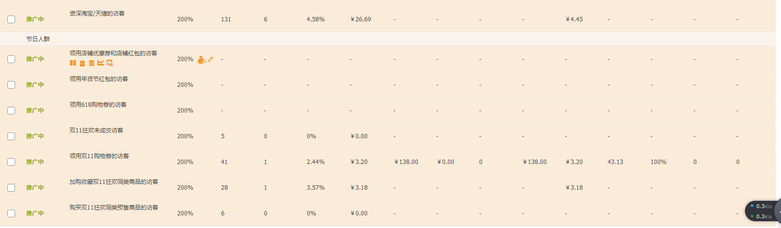 接下来就是人群,人群的话我们可以多开点人群,然后也是根据后期分析哪个人群表现好点击率不错,那么我们就去开这个人群,表现差的我们可以去删除掉,溢价的话我们也可以根据人群的表现来加价,这样操作下来我们的直通车开起来会更加的轻松,当然这里要跟大家提一下的是,我们的关键词不要跟定向一起开,在人群没有足够精准之前我都不建议大家去开定向,因为定向的点击率比较低,对人群的精准度要求比较高。