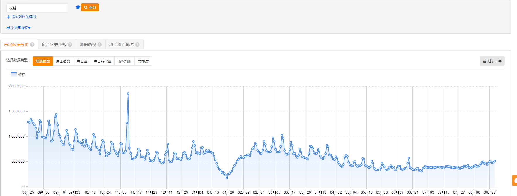 用凉鞋女为例。打开卖家中心的我要推广—淘宝直通车—流量解析输入凉鞋女,时间选择过去一年,我们会得到如图所示的一张数据图,