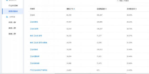 那么这样的数据是不是可以看出,自己产品选择什么样的关键词,例如你的产品是个新品卫生纸,那么就可以选择“产妇卫生纸孕妇产房用纸”这个词,搜索的人很多,同行很少,好竞争,转化也还可以的。